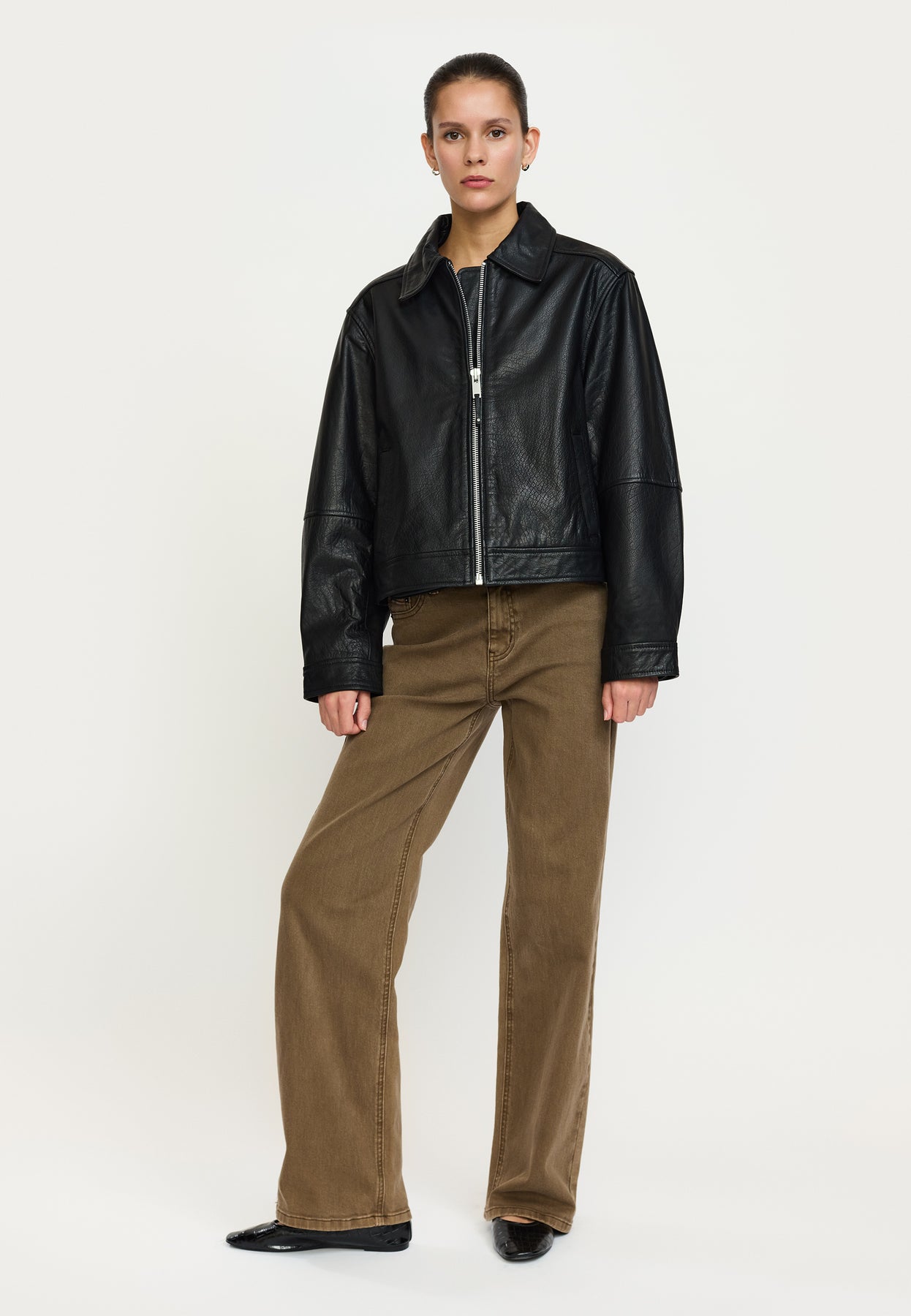 SRAkala Jacket - Black is a 100% leather outer layer with a clean, tailored silhouette designed for versatile everyday wear. Inspired by classic leather jackets and modern minimalism, it blends rugged durability with refined lines for city-ready style. Thoughtful construction and a compact fit help it layer smoothly over tees, knits, or light sweaters. This piece answers the need for a durable, sophisticated outer layer that transitions from casual to polished moments.