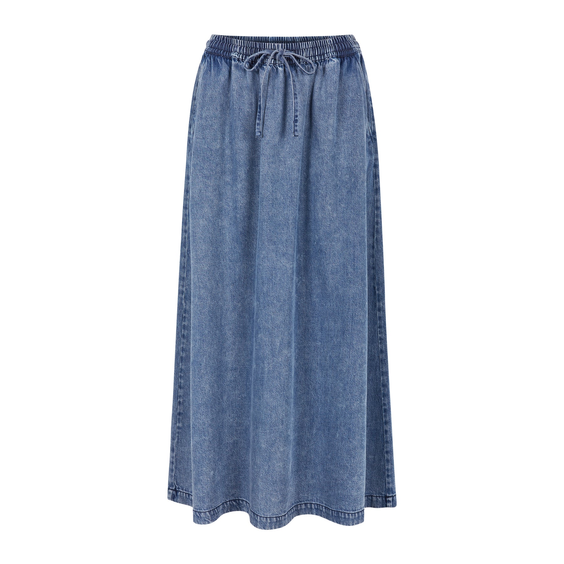 Midi-length denim skirt in a dark blue wash for versatile styling.