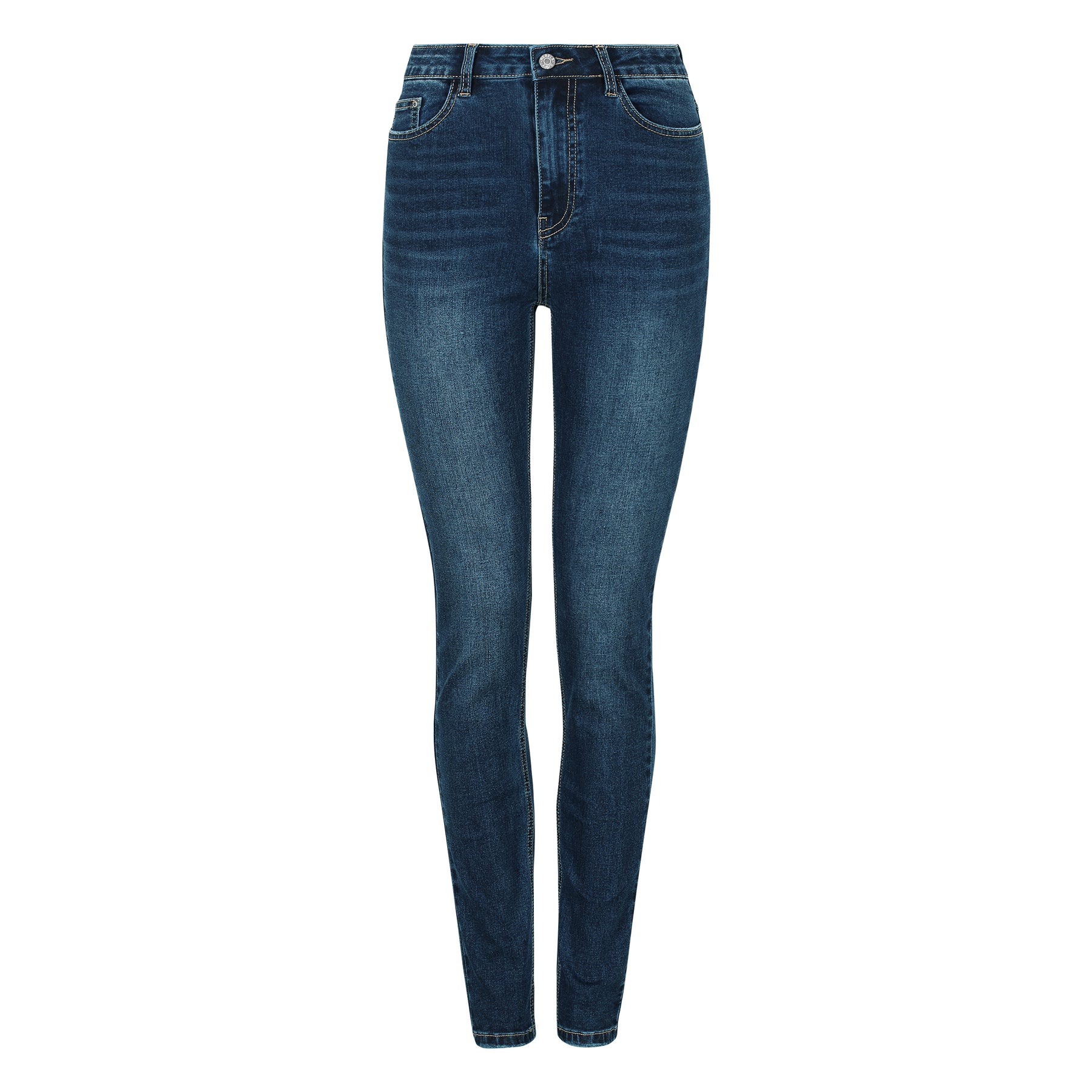 Classic high-waisted blue denim jeans with stretch and tight fit. Zipper and button at regurgitation. Five-pocket construction. The inner seam is 79 cm in all sizes.