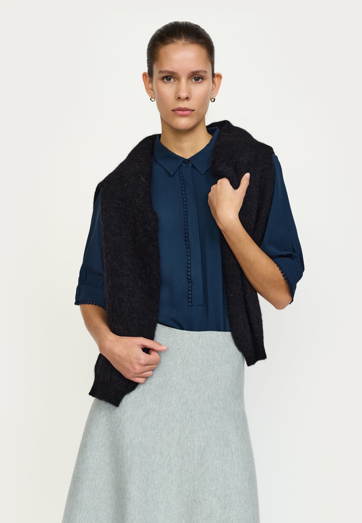 The SREbba Mayson Blouse in Total Eclipse presents a precise, fluid silhouette designed to move with you. Inspired by everyday versatility, this top blends clean tailoring with a soft, breathable drape that transitions from desk to dinner.